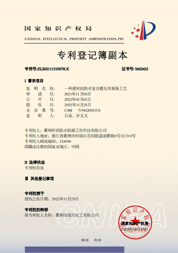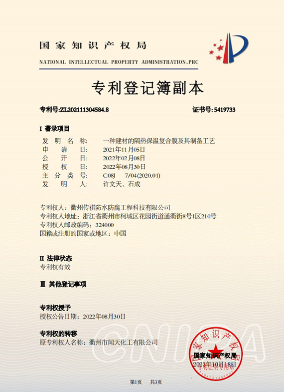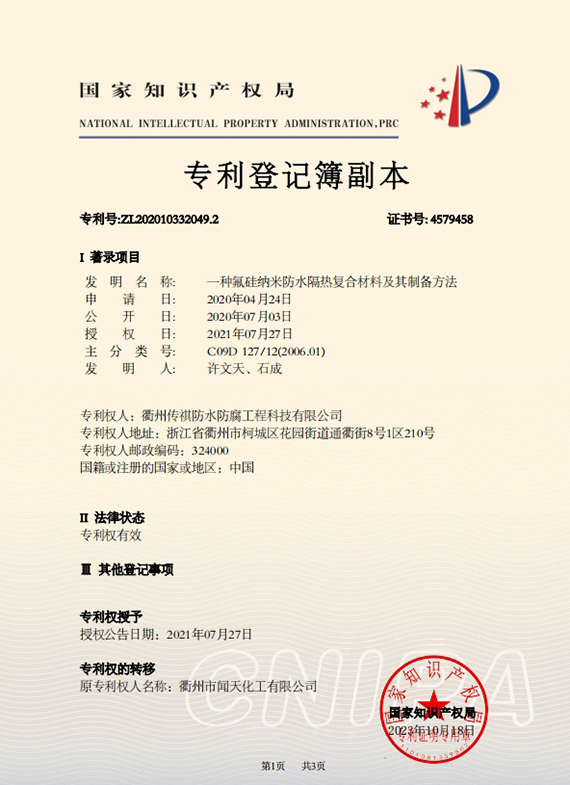 衢州傳祺新材料科技有限公司是衢州市聞天化工有限公司的下屬企業(yè);衢州市聞天化工有限公司成立于2003年,是國(guó)內(nèi)最早研發(fā)、生產(chǎn)氟碳涂料的企業(yè)之一。衢州傳祺新材料科技有限公司成立于2017年,公司專注于高分子氟材料的開發(fā)和含氟材料在防腐、防水領(lǐng)域的應(yīng)用。經(jīng)過(guò)6年的不懈努力,已獲得了化工和建筑領(lǐng)域六項(xiàng)國(guó)家發(fā)明專利授權(quán)和兩項(xiàng)新產(chǎn)品科技成果獎(jiǎng),參與了中國(guó)建筑材料流通協(xié)會(huì)《房屋修繕?lè)浪こ桃?guī)范》標(biāo)準(zhǔn)的編制工作,中建協(xié)涂裝委員會(huì)浙西工作站設(shè)立在我公司。